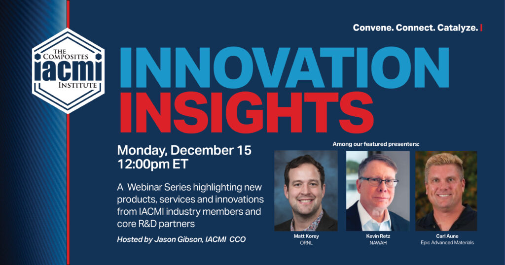 Our monthly webinar series “Innovation Insights” continued Monday, December 15 at 12:00 pm ET. IACMI CCO Jason Gibson moderated discussions with IACMI members featuring their latest news about products, services, technology, and innovations.