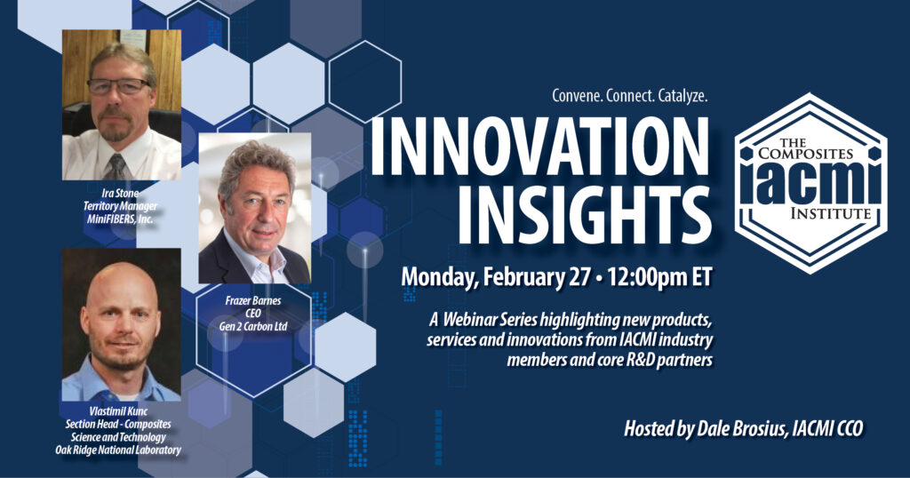 Watch Innovation Insights from February 27 featuring MiniFIBERS, Gen 2 Carbon, and Oak Ridge National Laboratory Our monthly webinar series “Innovation Insights” continued, as IACMI Interim CEO, Dale Brosius, will moderate discussions on recent technology advancements that industry may not be fully aware of. On Monday February 27 at 12PM ET, we hosted a one-hour series of presentations from IACMI members and partners, where they will provide background on new technology, products, and the key advantages provided, as well as application examples.