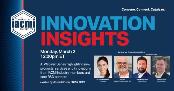 Our monthly webinar series “Innovation Insights” continues Monday, March 2, at 12:00 pm ET. IACMI CCO Jason Gibson moderates discussions with IACMI members featuring their latest news about products, services, technology, and innovations.