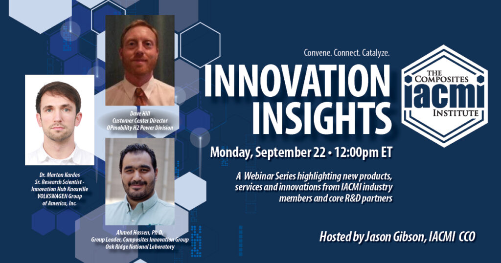 Our monthly webinar series “Innovation Insights” continued Monday, September 22, at 12:00 pm ET. IACMI CCO Jason Gibson moderated discussions with IACMI members featuring their latest news about products, services, technology, and innovations.